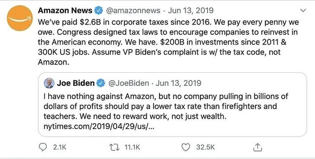 在同一年,后来成为总统的拜登也发推特表示:像亚马逊这样年入上百亿美元利润的企业,不应该支付比消防员、老师更低的税率。