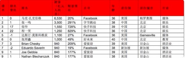 其中,前十名中有四位来自中国,分别是:张一鸣、宿华、程一笑、张邦鑫。五位来自美国,即扎克伯格、来自爱彼迎的Brian Chesky、Joe Gebbia、Nathan Blecharczyk,来自Facebook的达斯汀莫斯科维茨。还有一位新加坡的来自Facebook的Eduardo Saverin。