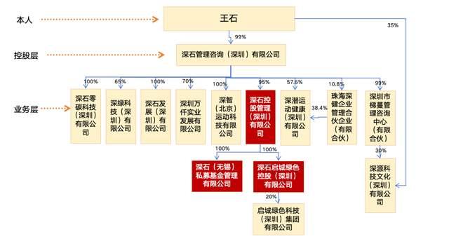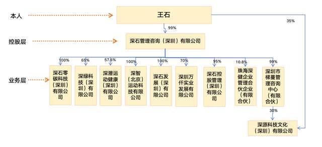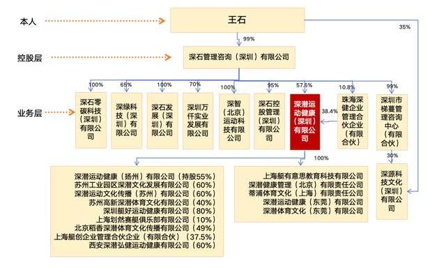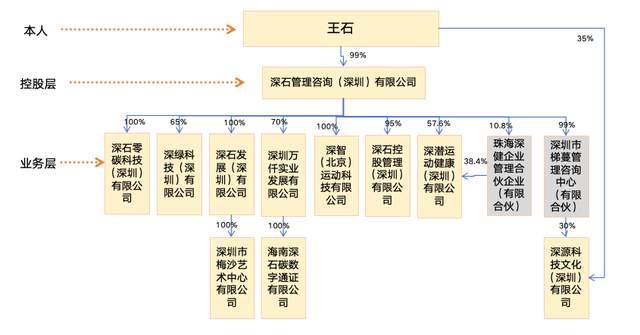 另一个有限合伙企业是珠海深健企业管理合伙企业(有限合伙),王石控制的深石管理咨询公司持有10.1%的份额,然后这家公司投资了深潜运动健康(深圳)有限公司38.4%的股份,相当于王石只是享有深潜运动健康公司60%左右的经济利益,但是通过多层次控股结构设计,用有限合伙的形式撬动了更多的资金。