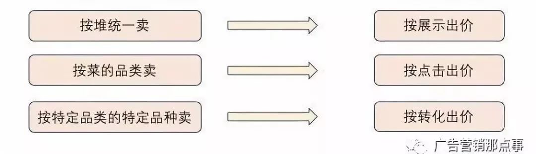 以上三种售卖方式分别对应按展示出价、按点击出价、按转化出价。