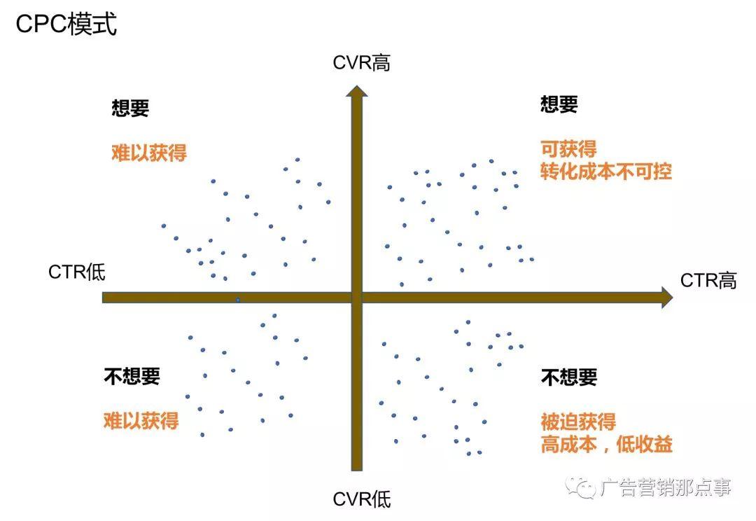 CPC:CPC模式下,点击率高的用户会更容易得到曝光,而高点击率的不一定是高转化率的,所以转化量和转化成本都是不可控。