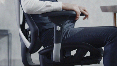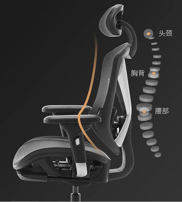 永艺的蒙柯人体工学椅,通过主动填补脊柱曲线,减小腰背压力,实时支撑头、颈、背、腰。