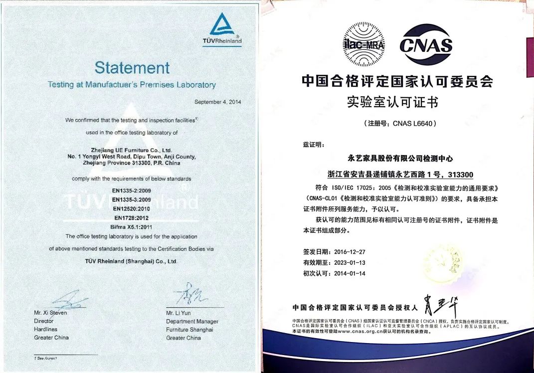 同时,永艺椅出厂前都会由获得国家CNAS认证与德国莱茵TUV集团认证的永艺实验室进行抽测。