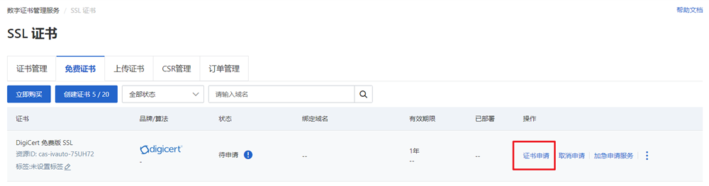二,开通好免费证书后,如上截图“创建证书”,创建证书后会出现下图页面,这里意思估计是生成了证书订单,还得继续点击“证书申请”才真正进入证书申请页面。