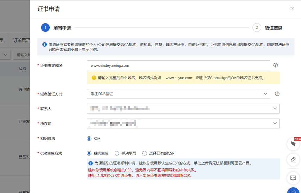 三,申请证书如下图,最主要是输入要申请证书的域名,这里建议输入带www的域名,这样申请的证书到时就会包含没有加www的主域名,免费SSL证书基本都是限定一个域名使用的。域名验证方式根据自己清空选择手动DNS验证或者是文件验证。再进入下一步就会到验证页面,如果是DNS验证,就根据提示在域名控制面板里设置相应解析,解析后过一小会进行验证,如果是文件则上传对应的文件到站点目录。