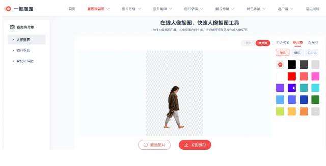 比如大家常用的人像抠图,直接点击带有人物的图片,上传图片即可完成抠图,还能在右侧重新更换图片背景,也可以直接点击立即保存完成的抠图文件。