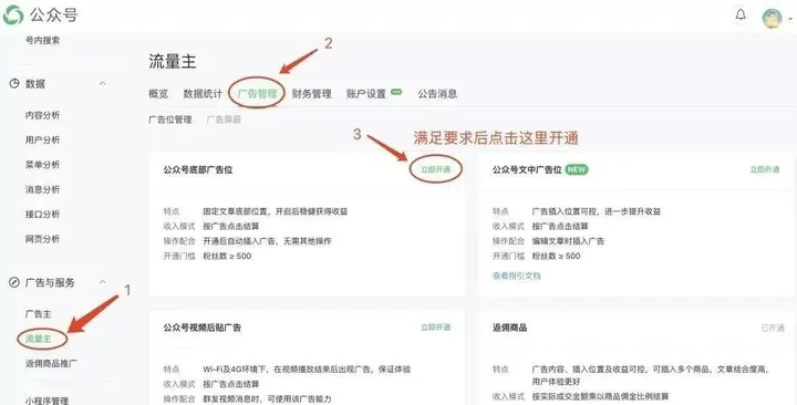 开通要求:一般阅读量500以上,会有广告主陆续找你投放广告,你的账号阅读量越高,找你的商家会越多,单价也会随之越高,阅读量低于500也会有人找合作,但是找的人不多。