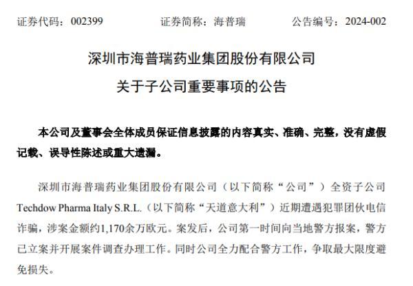 海普瑞(002399.SZ)1月14日晚间公告,全资子公司Techdow Pharma Italy S.R.L.(简称“天道意大利”)近期遭遇犯罪团伙电信诈骗,涉案金额约1170余万欧元(约合9100万人民币)。