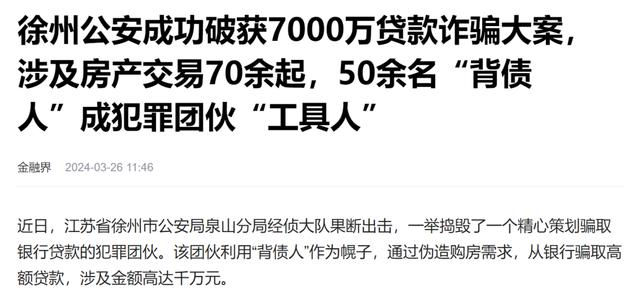 2023年10月,徐州警方抓捕了一个房贷诈骗团伙。该团伙从2019年就开始骗取房贷,共诱骗50余名入职员工作为“背债人”,以其名义购买房产70余处、累计骗取银行贷款7000余万元。