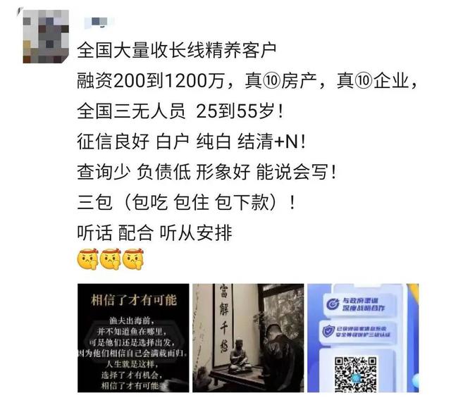“大量收24~50岁优质客户,能说会背,总额度300到800万,配合=拿钱。”