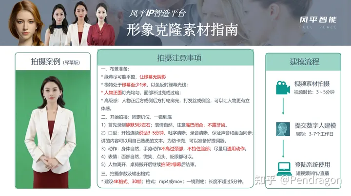 再来说说私有专属数字人定制的流程,各家基本是大同小异的。一般是自己想办法拍摄一段符合要求的视频素材,提交给平台进行训练。拍摄过程并不复杂,就是在镜头前说话几分钟,但无论如何一定要重视,因为取材拍摄的质量直接决定最后数字人训练出来的效果。所以建议大家在拍摄的时候要苛求完美,妆容、服装搭配、打灯效果,还有录制时的神态与动作等都要追求完美,为了最后的效果多拍几遍是值得的。值得一提的是,风平智能还提供AI捏脸生成数字人的选项,就是通过AI技术融合出一个现实中不存的面容的数字人,可以很大程度上避开真人形象存在肖像使用权的问题。