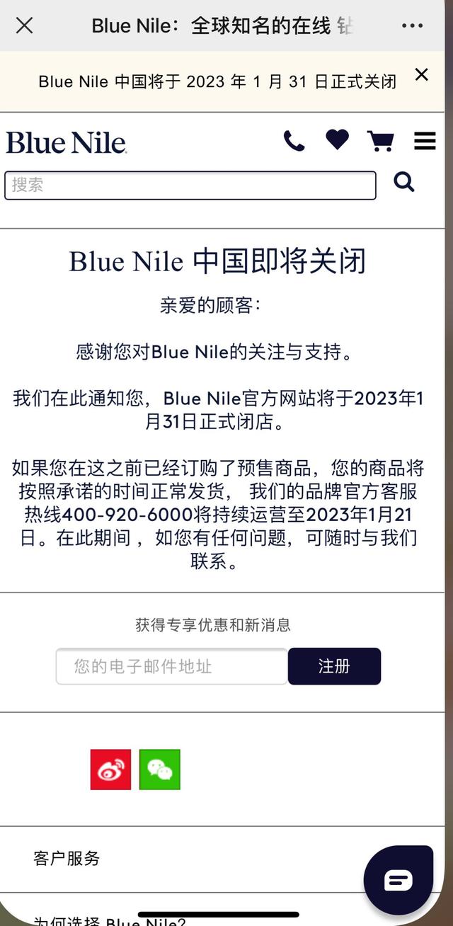 而Blue Nile中国内地官网将在2023年1月31日正式关闭。界面新闻在Blue Nile中国香港官网未看到闭店信息。