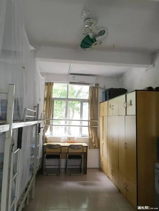 空调的宿舍一间有8个人,一把风扇;非空调的一间有6个人,有两把风扇。每层楼有一台洗衣机。