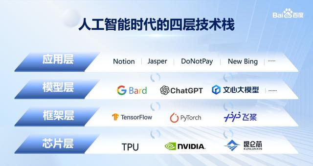 芯片层的变化是,主流芯片从CPU变成了GPU。以百度为例,其在芯片层的布局是昆仑芯,已经量产几万片,昆仑芯第三代,预计2024年初量产;芯片层之上,叫做框架层,即深度学习框架。据了解,百度的飞桨在国内的市场份额排第一。