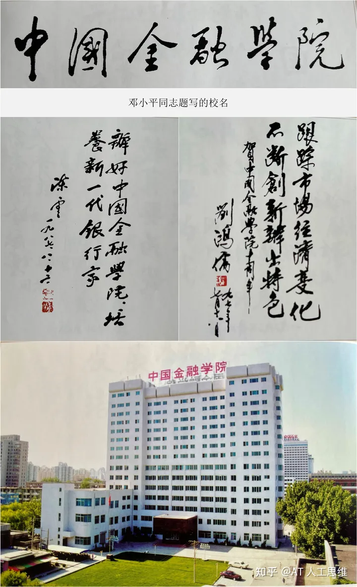 关于吴巍就读的这所大学,因为存在的时间不长,可能很多人比较陌生,这里我简单介绍一下。中国金融学院是适应国家金融体制改革的需要,由中国人民银行总行牵头,联合其它八大金融机构共同出资所创办的一所以金融学科为主体的理事会领导下的全日制普通高等学校。邓小平同志题写校名,陈云同志题词:“办好中国金融学院,培养新一代银行家。”(见下图)陈云同志的题词为中国金融学院指出了办学方向和目标。1987年9月20日,中国金融学院召开成立大会,时任国务委员兼中国人民银行行长陈慕华出席大会并担任第一任名誉院长,中国人民银行副行长、著名金融专家刘鸿儒担任第一任院长。虽然中国金融学院是一所普通高等学校,但由于每届招生人数很少,京外考生被列入第一批录取,因此,学生素质很高。后来因教育体制改革,该学院于2000年与对外经济贸易大学合并,成为对外经济贸易大学金融学院。