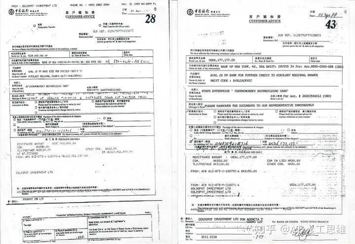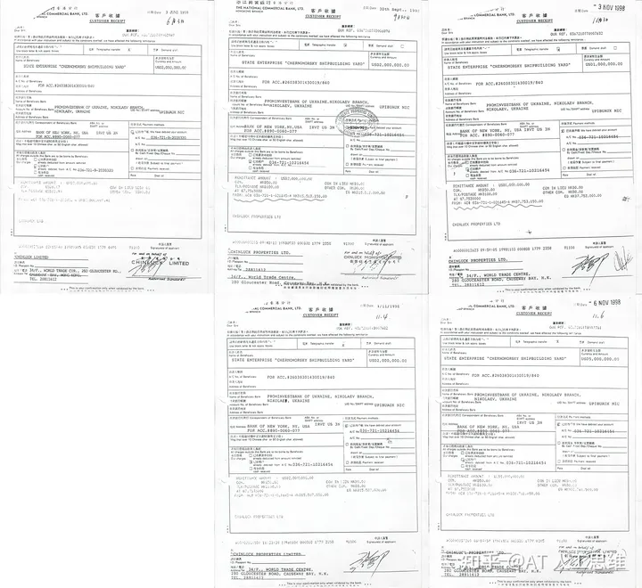 在航母购买合同的履行方面,除了徐增平支付给黑海造船厂合同定金200万美元(1998.06.03,实际上也不是徐增平个人的资金),及徐增平利用泰信达公司支付给他的2.3亿元人民币支付给黑海造船厂1000万美元(见下图,徐增平的付款凭证:1998.09.30,200万美元│1998.11.03,100万美元│1998.11.04,200万美元│1998.11.06,500万美元;其余资金约1.3亿元人民币被徐增平挪用并据为己有)外,剩余的合同款800万美元(1999.04.30)及违约金等费用809万美元(1999.09-11期间)都是由香港达程公司代澳门创律公司支付给黑海造船厂的(见下图,达程公司的付款凭证 ),后两笔资金的支付都已与徐增平和其它方无任何关系。