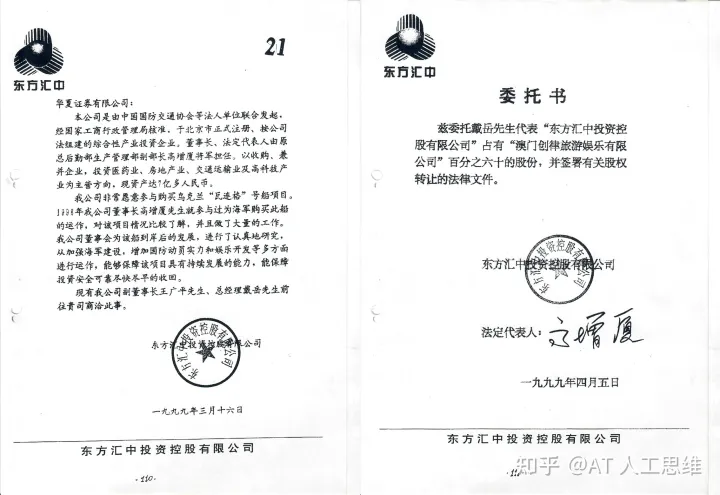 邵淳后来在谈起这段往事时说,他之所以当时没有反对李某,不是不相信吴巍,而是认为吴巍当时太年轻,怕他担不起这么大的项目,所以有些犹豫。吴巍后来则认为:邵淳之所以犹豫,主要是因为他当时已背着吴巍等人通过自己的同学(原总后财务部的领导),暗中联系了一家号称有军方背景的公司——东方汇中投资控股有限公司(以下称:东方汇中公司,吴宇后来曾对吴巍说过:其负责人说过“代表军委”,这回找对人了!吴巍对此说法表示高度怀疑!),准备让东方汇中公司接手“瓦良格”号航母项目的后期运作,甚至在泰信达公司或达程公司依合同持有的澳门创律公司49%的股权尚未依法落实的情况下,邵淳就私自非正常地承诺让东方汇中公司持有澳门创律公司60%的股权(见下图,注意文件签署日期)。那时候的邵淳其实已陷入了一个误区,一直试图寻求国家方面的力量介入运作“瓦良格”号航母项目。可他忽视了一个显然的事实:如果国家方面的力量能正常介入,这个项目开始时还用找徐增平来暗中代为运作吗?还用在民间寻找资金支持吗?正是因为邵淳陷入了这一误区,不仅所引入的东方汇中公司给“瓦良格”号航母项目的后期运作带来了大麻烦,而且也因此最终(1999.11)导致“瓦良格”号航母项目被其盲目信任的助理罗贤平(国家某部外线工作人员)联合副总赵大建向证监会副主席陈耀先举报。(东方汇中公司后期运作“瓦良格”号航母项目失控后,邵淳曾和吴巍说过,通过罗贤平能够得到国家某部支持,就让吴巍准备了全套项目资料通过罗贤平交给国家某部,吴巍根本不信这件事但劝说邵淳无果!最终,正是这些资料成为了罗贤平等人的举报证据!)