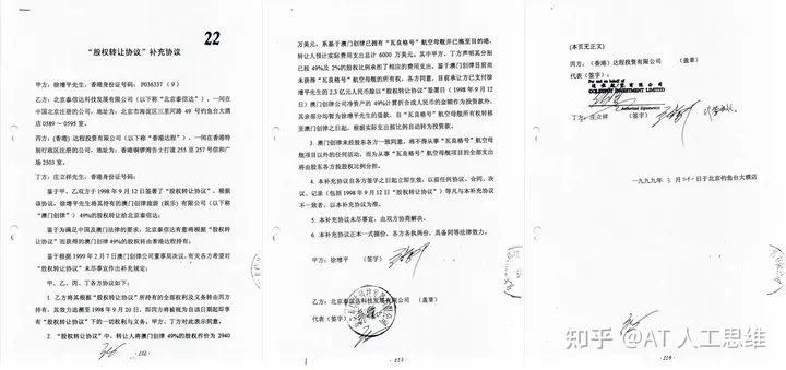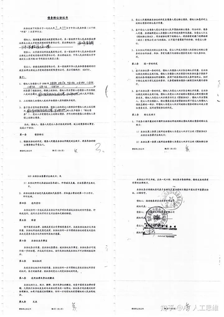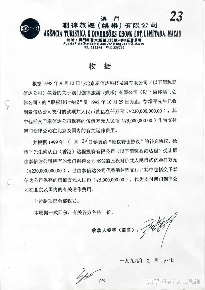 1999年3月21日,经过各方的多次协商,在吴巍的积极安排和组织下,突破李某设置的重重阻碍,泰信达公司、徐增平等与达程公司在北京钓鱼台大酒店共同签署了《<股权转让协议>补充协议》(见下图:关键备查证据 ⑥),徐增平也签署了收到泰信达公司支付的2.3亿元人民币的收据(见下图:关键备查证据 ⑦),同时,泰信达公司、隆泰源公司与达程公司共同签署了《债务转让协议书》(见下图:关键备查证据 ⑧)。为满足中国、香港及澳门法律的要求,将泰信达公司持有的澳门创律公司49%股权转为达程公司持有,并由达程公司承担了泰信达公司对隆泰源公司的债务。吴巍也自此终止了与李某和陆某的合作关系。