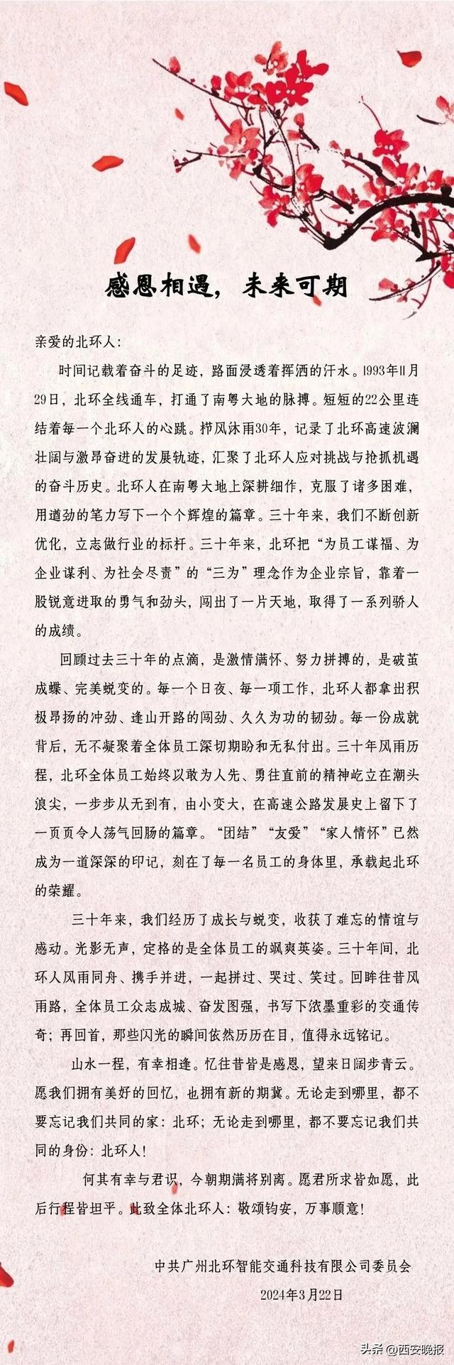 “何其有幸与君识,今朝期满将别离。愿君所求皆如愿,此后行程皆坦平……”3月22日18时,广州北环智能交通科技有限公司在其公众号上发布了一封感谢信,对北环高速公路三十年的发展历程进行了回顾。