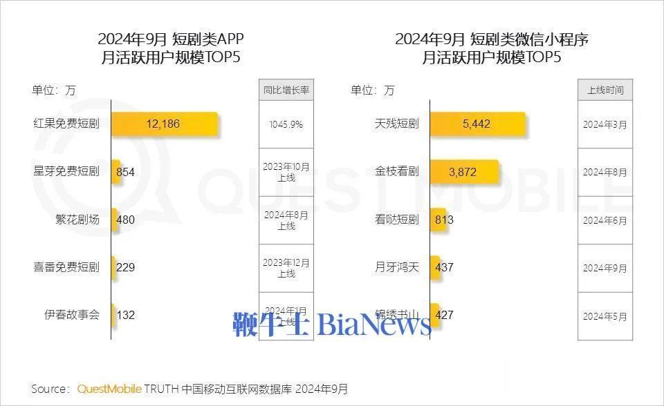 11月发布的秋季数据显示,字节跳动旗下免费短剧APP红果月活达到1.2亿,九州旗下星芽短剧APP位列第二,月活854万。