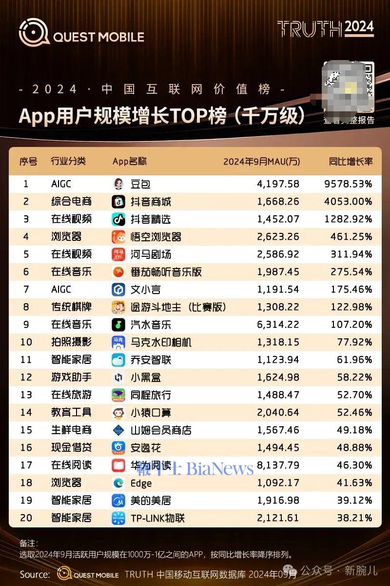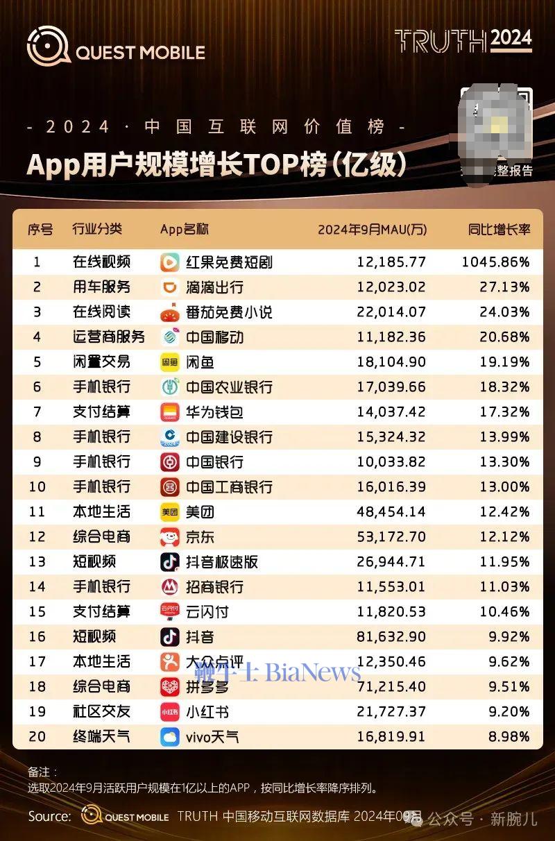 在整个2024年,APP用户规模亿级增长TOP榜中,红果高居榜首,同比增长达到1046%,十倍于2023年。