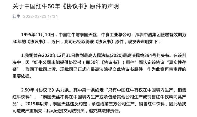 2016年10月,泰国天丝向华彬集团发起商标侵权诉讼,理由是双方约定的20年授权到期,华彬集团需停止使用红牛品牌。华彬集团方面则反驳称,双方最初协商的经营期限为50年。