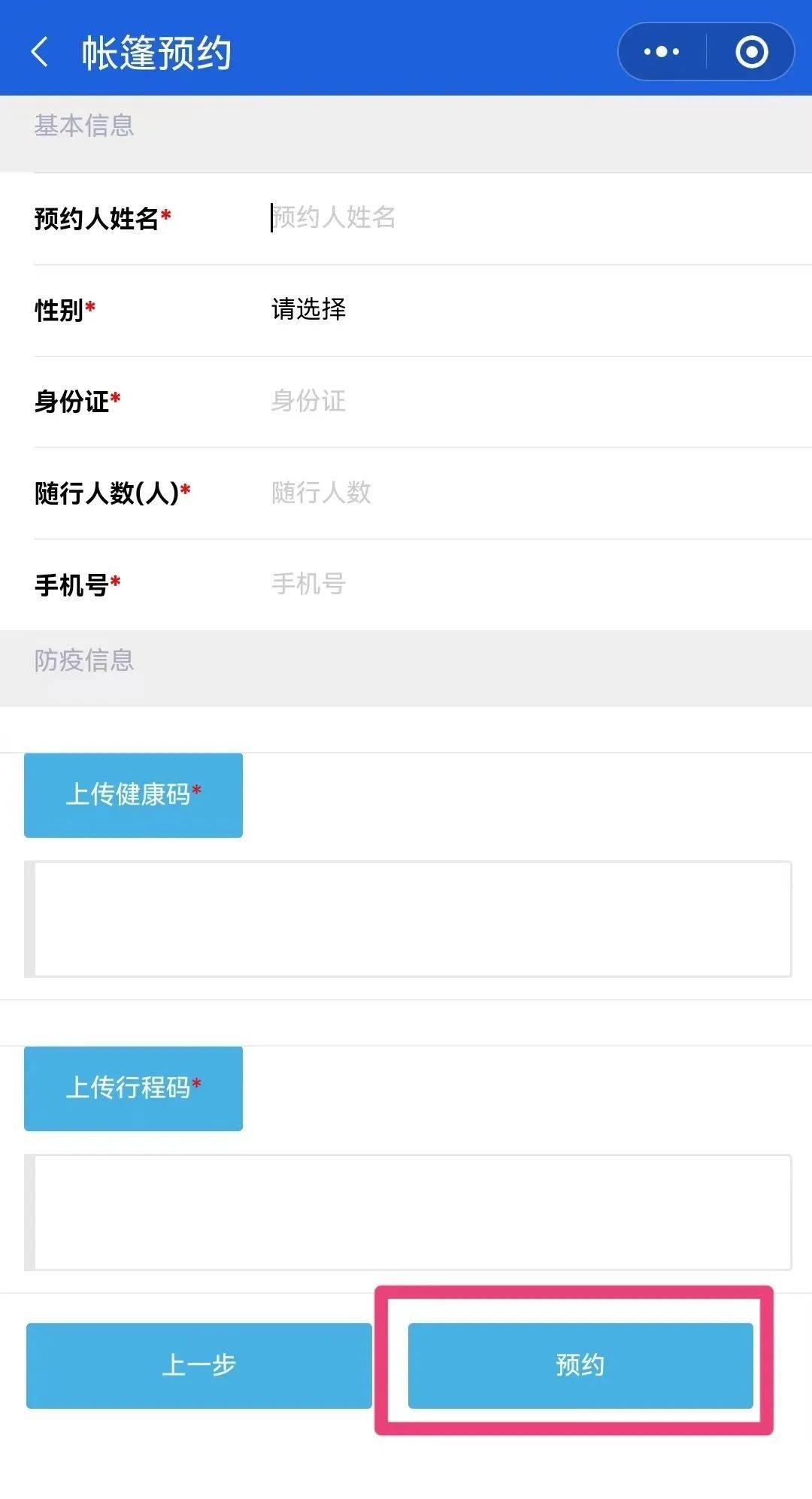 ③填写预约人姓名等基本信息,并上传健康码、行程码双码,确认无误后提交。