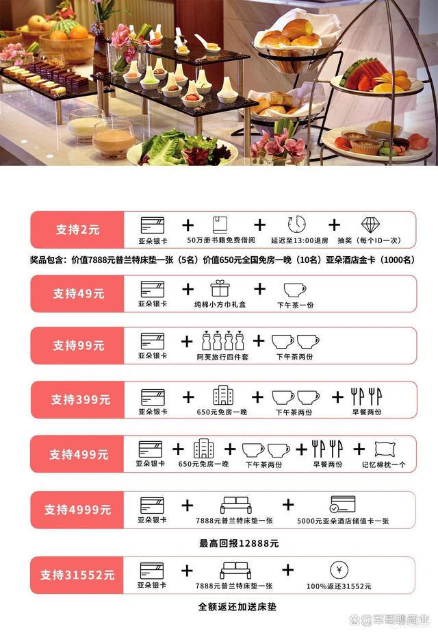 投资人可获得的回报收益,包括了实体的酒店相关产品,例如床垫、亚朵酒店储值卡、沐浴护肤旅行套装、下午茶套餐、记忆枕等,还享有专属的会员权益。