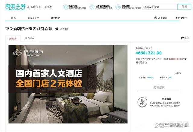 2015 年8月12日,亚朵酒店与淘宝网首次合作众筹酒店项目,项目持续 44 天,目标筹集金额为 200 万,此次众筹资金将用于支持亚朵旗下加盟店的建设。项目单项投资金额最低2元,最高4999 元。