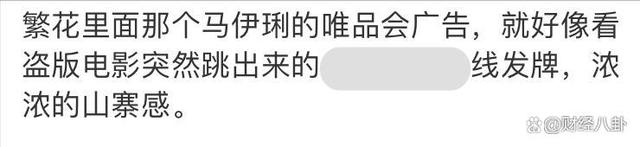 在热播剧《繁花》中同样不会缺少唯品会的身影,马伊琍穿着和剧中人设完全不相符的品牌服装出现在中插广告中。唯品会和王家卫风格搭在一起的突兀性还在网上引起了一波热议。