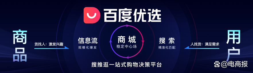 根据介绍,百度优选的定位是搜逛推一体的智能电商平台,在电商大脑的依托下,在搜索、直播、视频、商城四个场域,将用户与场景进行链接和交互,深度融合人找货、货找人,促成交易。