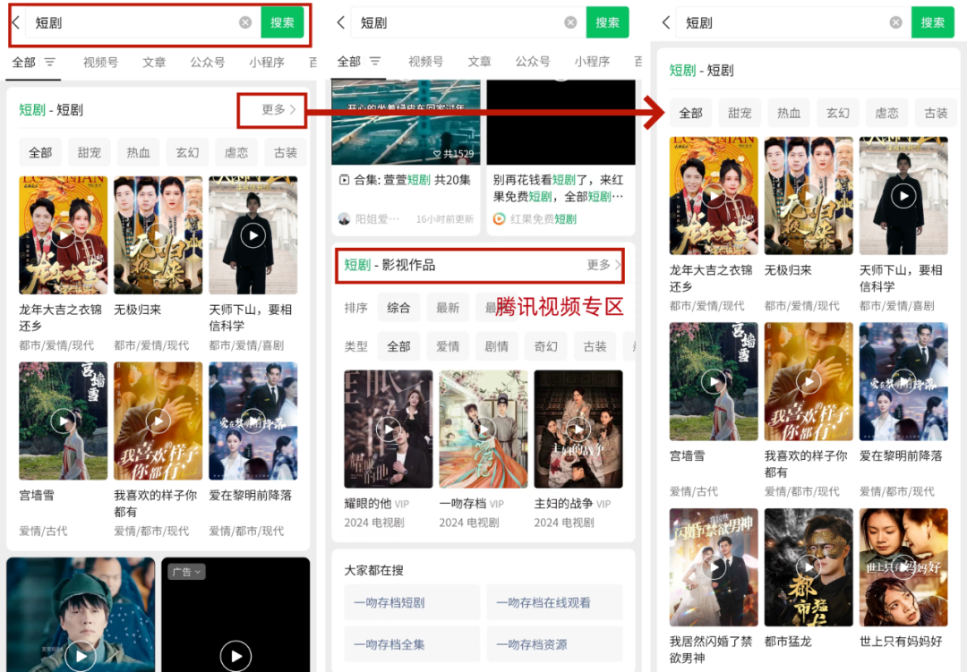 只需要在微信搜索框搜索”短剧“,就能直达短剧专区,点击短剧海报即可跳转到相应小程序播放。页面下拉还有一个腾讯视频专区,其中的短剧都是跳转“腾讯视频”小程序播放。点击“更多”跳转的正片合集,俨然一个视频播放平台。