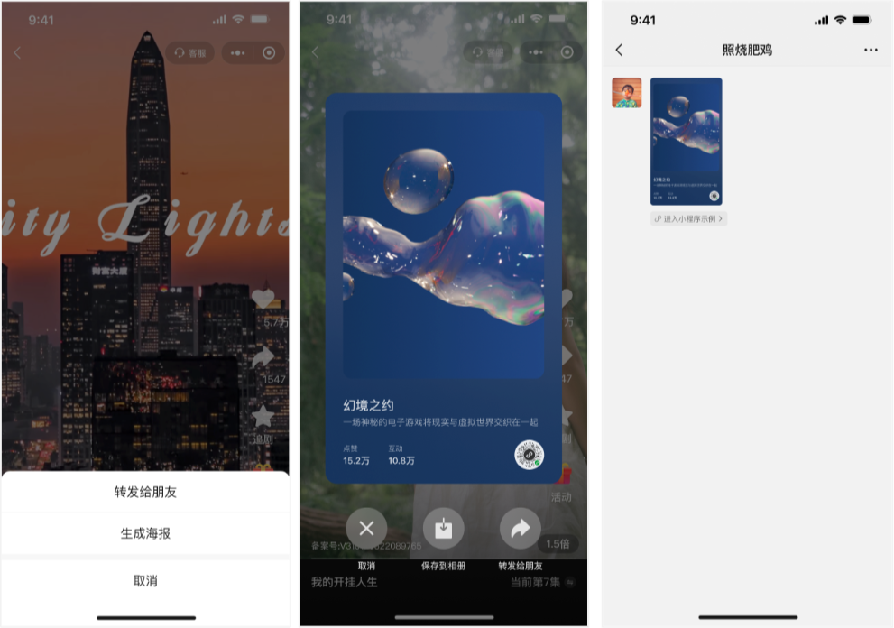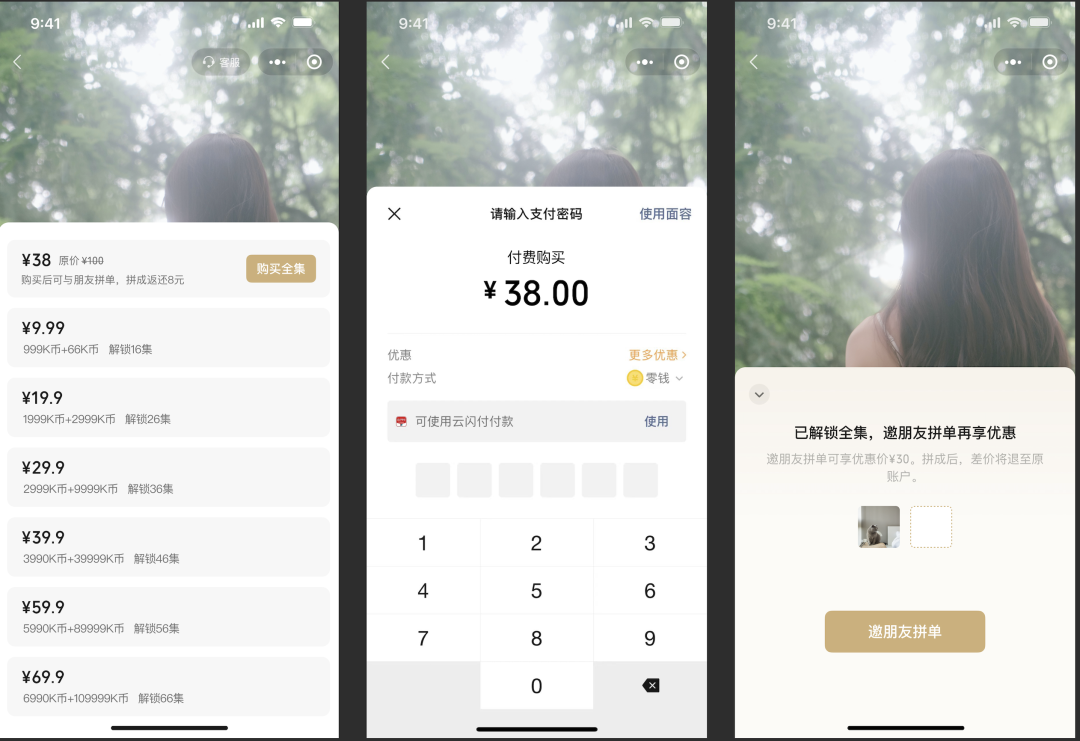 从拼团玩法的链路来看,这一功能是瞄准了微信的私域流量,发起拼团的用户要通过私聊、社群和朋友圈这些链路来完成拼单。但目前由于门槛的限制,拼团功能更多只能作为剧方的一种拉新手段。与此同时,短剧自习室发现,目前微信的部分短剧小程序是无法分享到朋友圈的,这也意味着微信对短剧还是保持着较严格的管理。