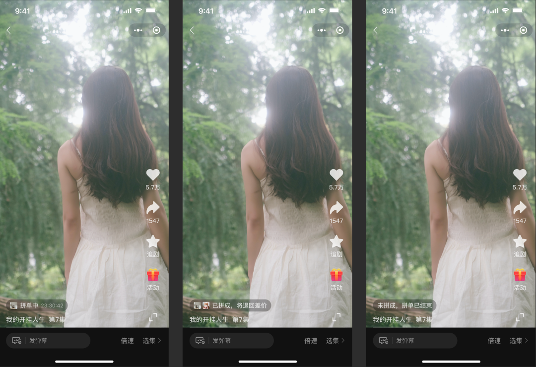 在拼单过程中,视频左下角会展现拼单进度,包括拼单中、已拼成、未拼成三种状态显示。